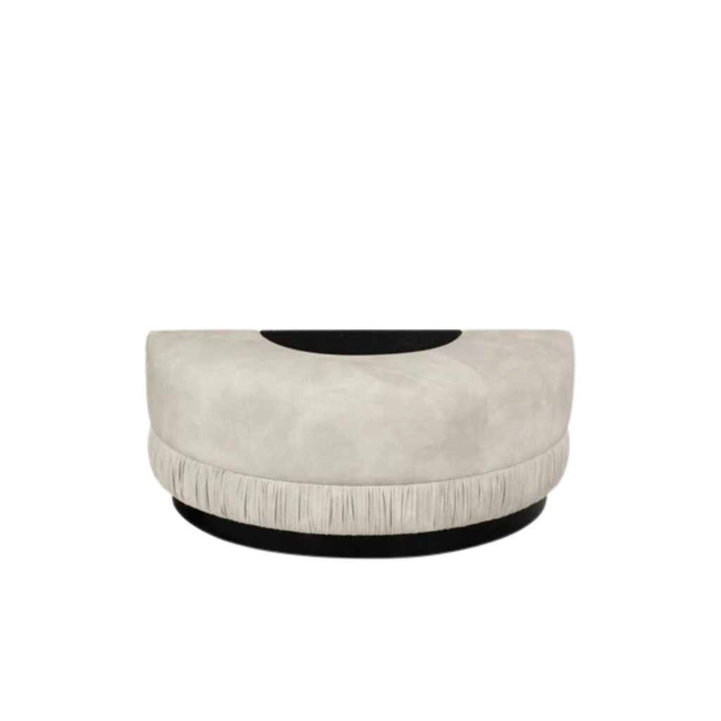 The traditional demi lune shape becomes a stunning bench when striking ruching, inset marble and a lacquered base unite. A statement welcome in a foyer or the perfect break in a long hall, Drop-Bag is far from an ordinary bench, it is your perfect bag drop.